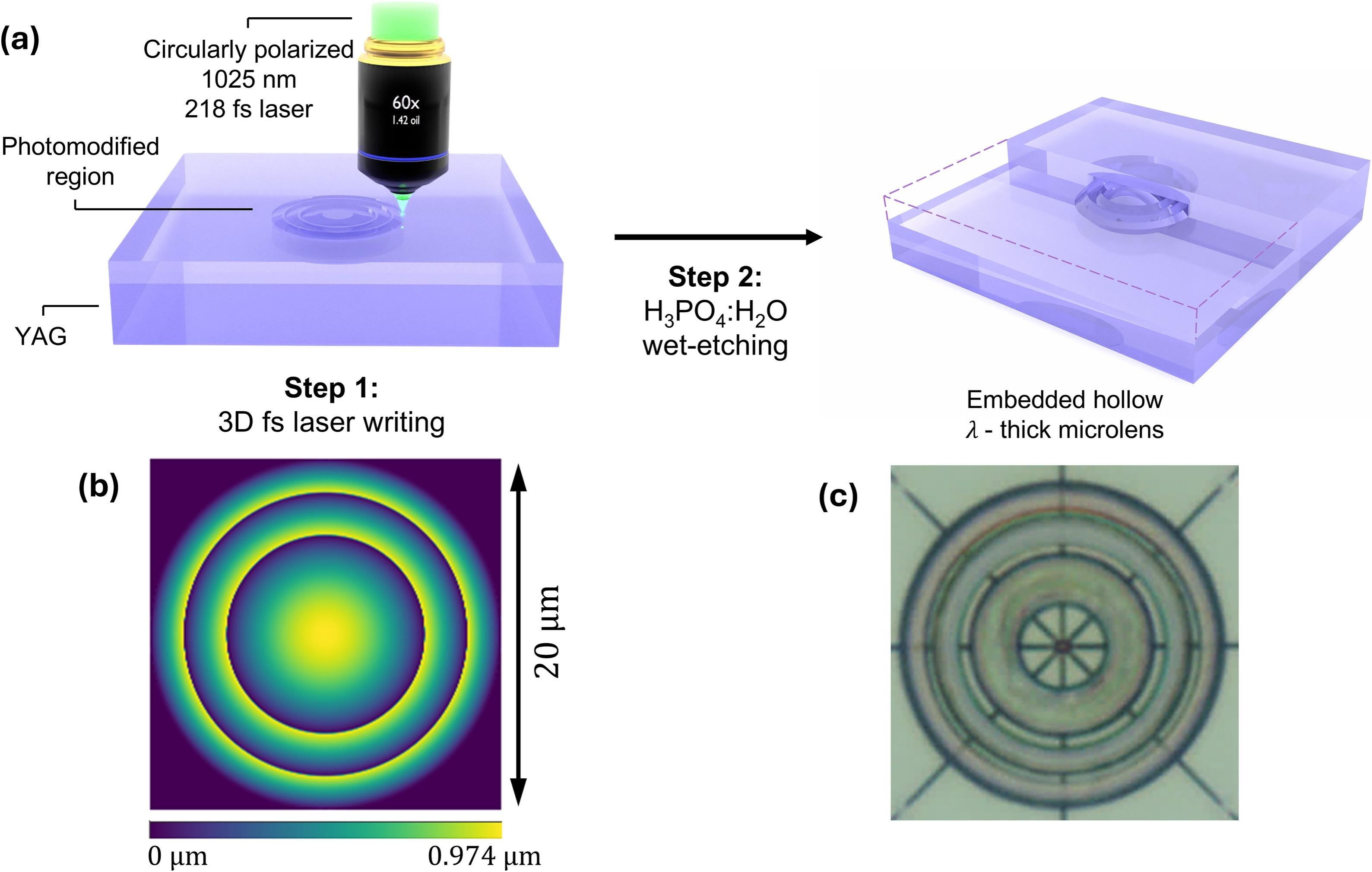Franzette Paz-Buclatin et al. demonstrate the 3D nanofabrication of hollow nanostructured λ-thin lenses inside all single-crystalline YAG crystals. The seminal demonstration includes various designs with medium and high numerical apertures, and a measured optical fidelity above 95% for the first prototype, highlighting the potential of the group’s technology.